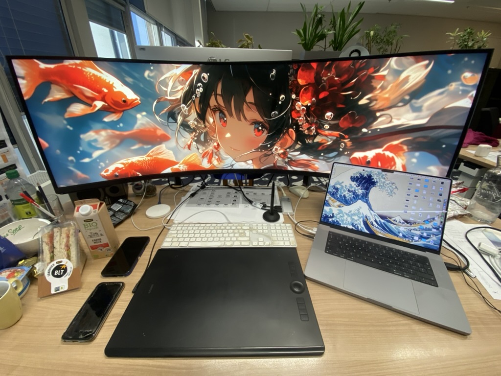 The most monstrous monitor one could buy at the moment. 57″ wide, a woooooping resolutaion of 7680×2160. It’s like two 4K UHD screens glued together and it is awesome!