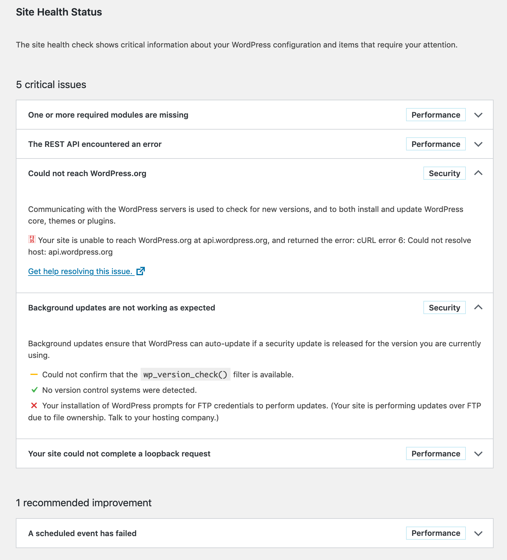 I recenlty moved my WordPress installation to another server; the one it was on was acting slow most of the time, which annoyed me in some cases. But now on the new server I get this bitching screen again when I run Tools > Site Health.